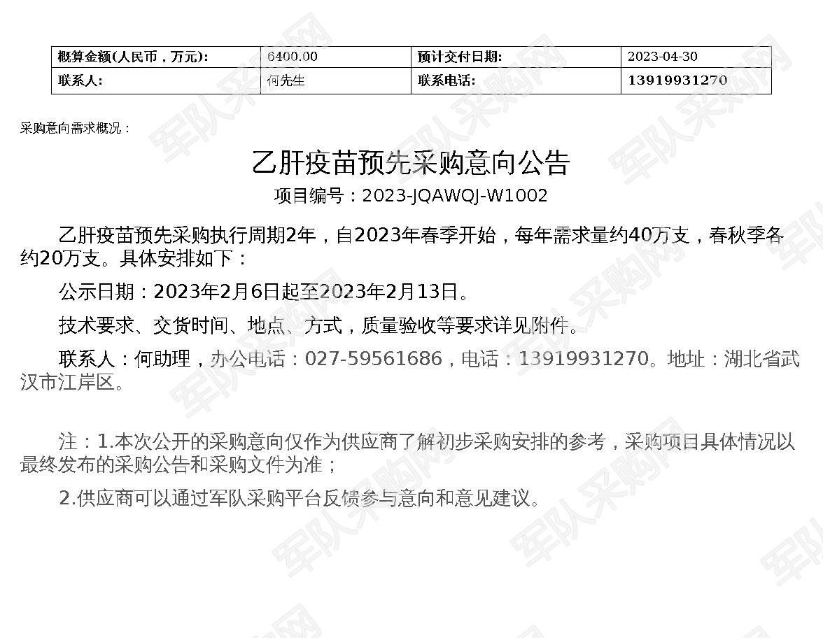 【军队采购】军队采购网乙肝疫苗预先采购意向公告(2023-JQAWQJ-W1002)