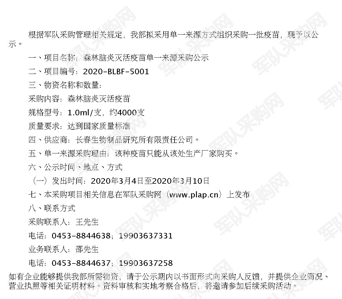 【军队】军队采购网森林脑炎灭活疫苗单一来源采购公示 (2020-BLBF-5001)