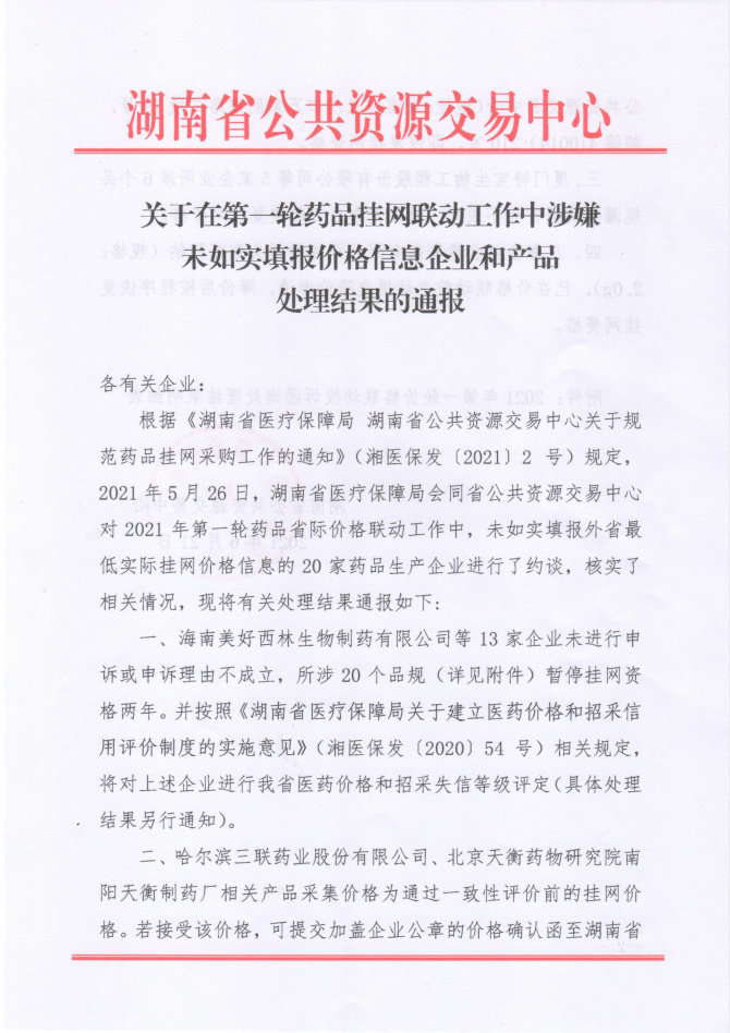 【湖南】2021年湖南省关于在第一轮药品挂网联动工作中涉嫌未如实填报价格信息企业和产品处理结果的通报