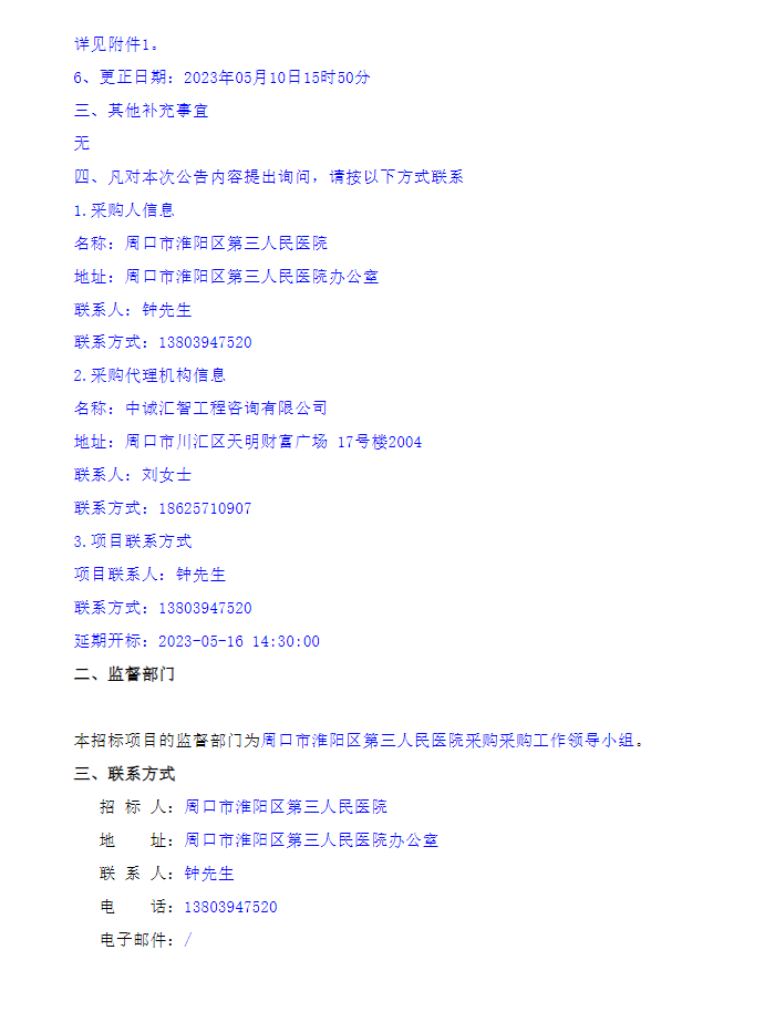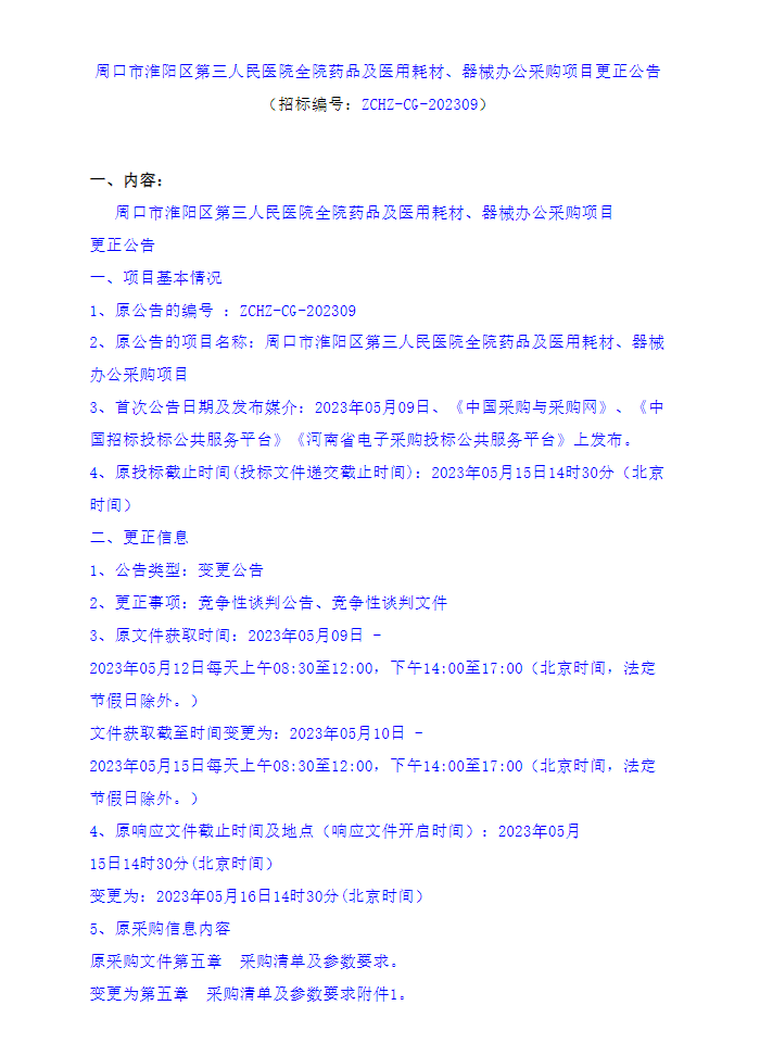 【周口市淮阳区第三人民医院】河南省周口市淮阳区第三人民医院全院药品及医用耗材、器械办公采购项目更正公告