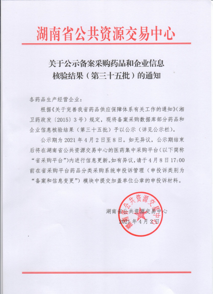 【湖南】2021年湖南省关于公示备案采购药品和企业信息核验结果(第三十五批)的通知