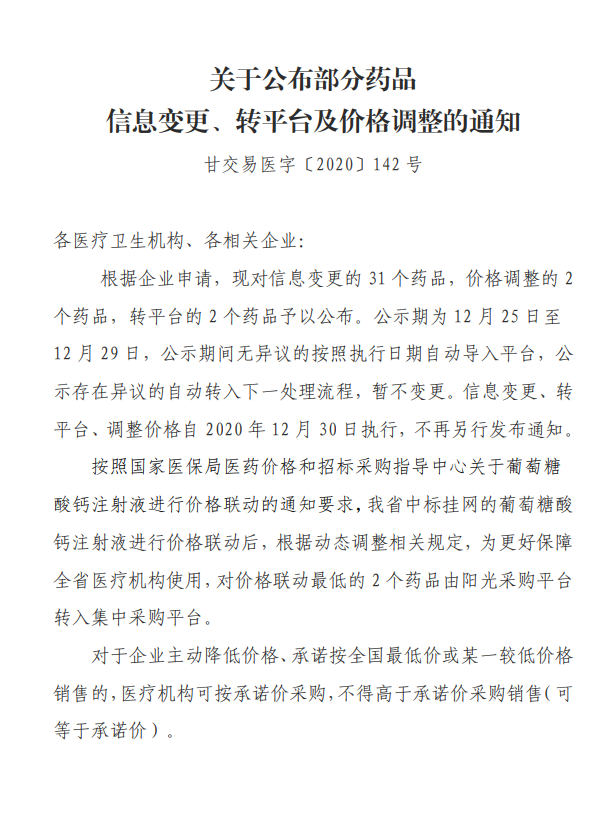 【甘肃】甘肃省关于公布部分药品信息变更、转平台及价格调整的通知
