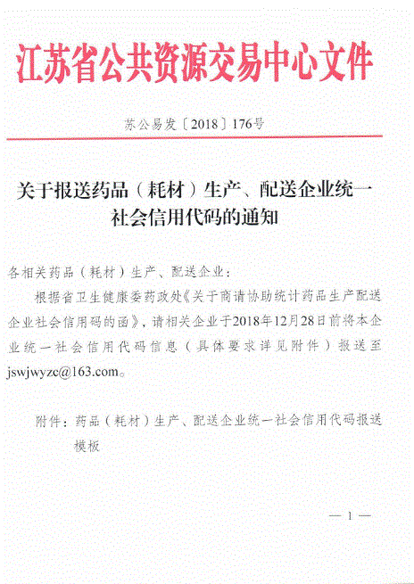 【江苏】2018年江苏省关于报送药品(耗材)生产、配送企业统一社会信用代码的通知