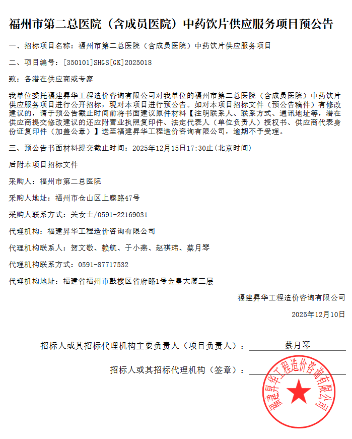 【福州市第二总医院】福建省福州市第二总医院(含成员医院)中药饮片供应服务项目预公告