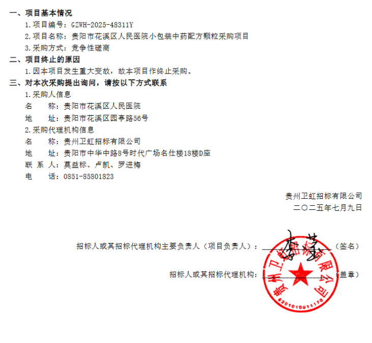【贵阳市花溪区人民医院】贵州省贵阳市花溪区人民医院小包装中药配方颗粒采购项目终止公告