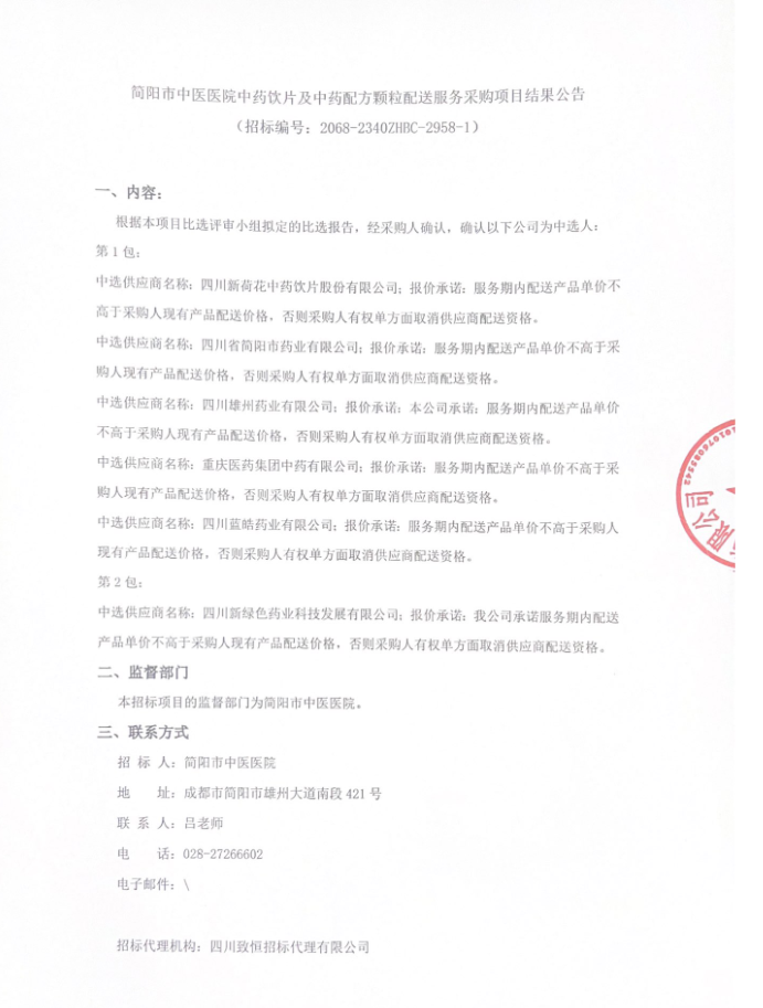 【简阳市中医医院】四川省成都市简阳市中医医院中药饮片及中药配方颗粒配送服务采购项目结果公告