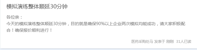 各位亲: 今天的模拟演练整体顺延30分钟,目的就是确保90%以上企业两次模拟均能成功,请大家积极配合!确保报价顺利进行!