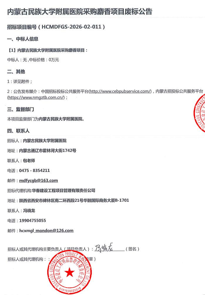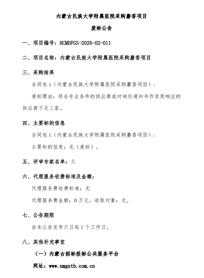 【内蒙古民族大学附属医院】内蒙古民族大学附属医院采购麝香项目废标公告