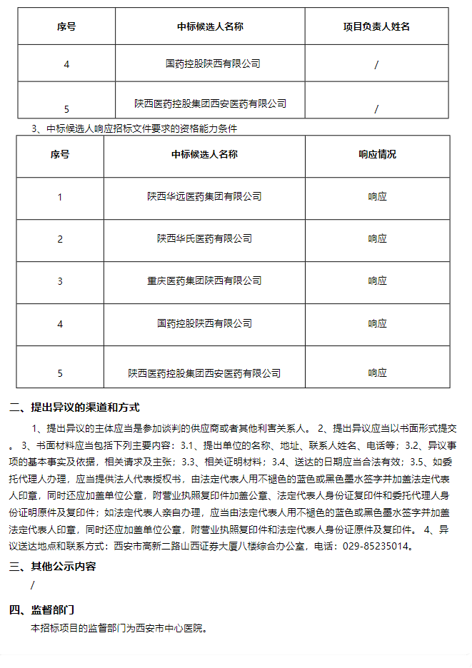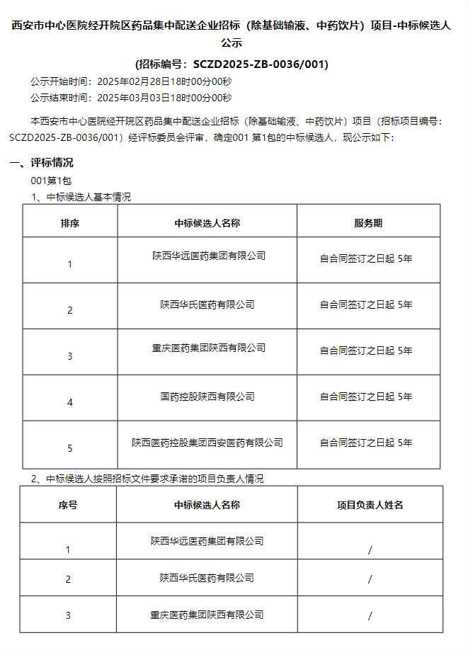 【西安市中心医院】陕西省西安市中心医院经开院区药品集中配送企业招标(除基础输液、中药饮片)项目-中标候选人公示