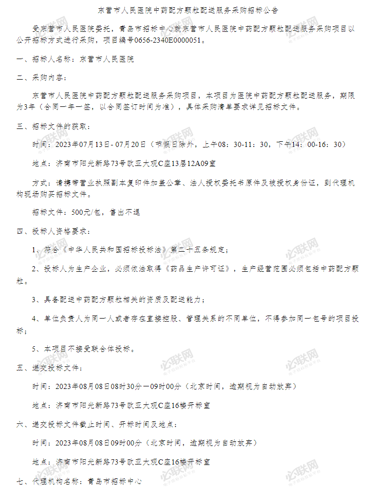 【东营市人民医院】山东省东营市人民医院中药配方颗粒配送服务采购招标公告