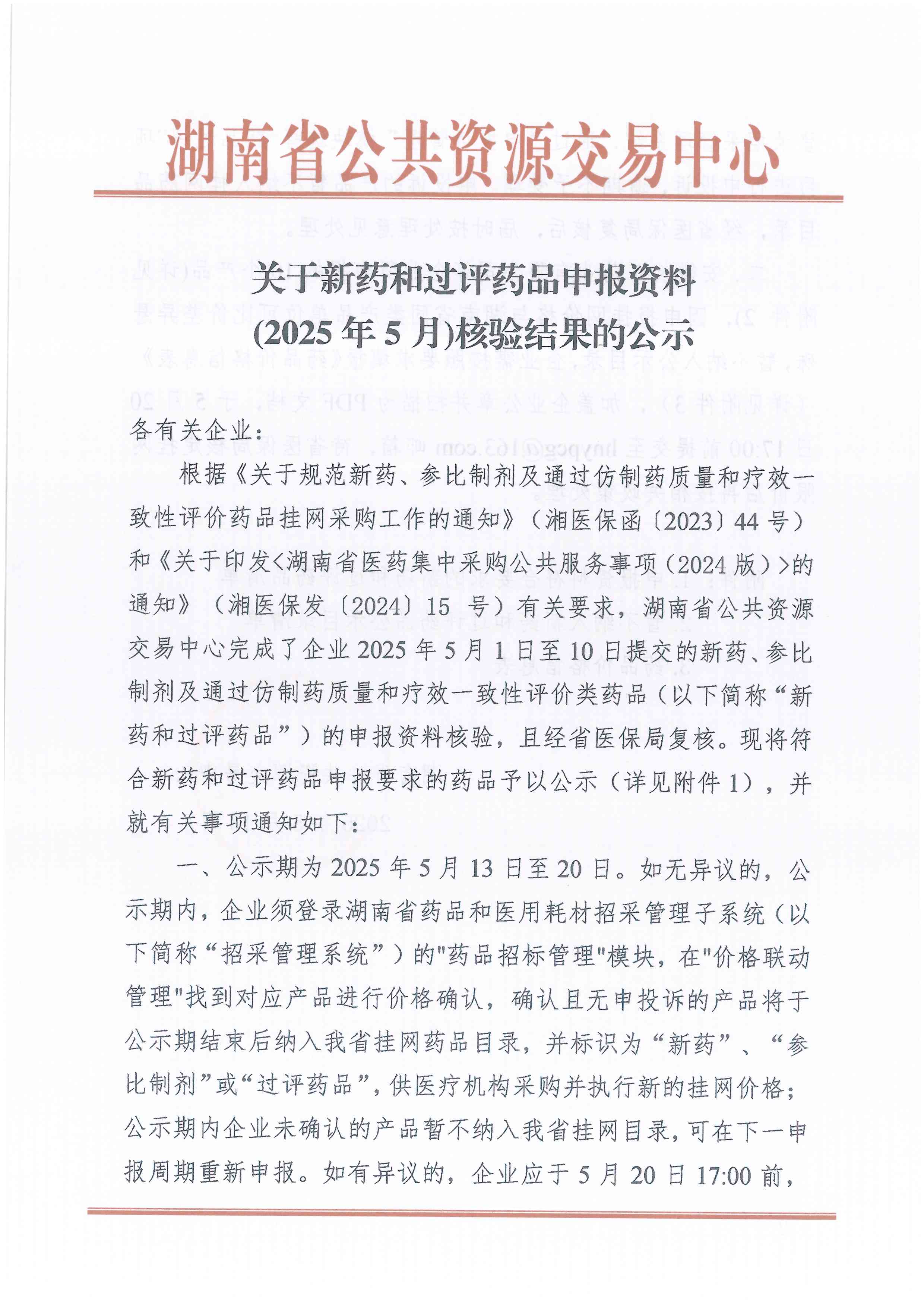 根据《关于规范新药、参比制剂及通过仿制药质量和疗效一致性评价药品挂网采购工作的通知》(湘医保函〔2023)44号〕和《关于印发<湖南省医药集中采购公共服务事项(2024版)>的通知》(湘医保发〔2024〕15号)有关要求,湖南省公共资源交易中心完成了企业2025年5月1日至10日提交的新药、参比制剂及通过仿制药质量和疗效一致性评价类药品(以下简称“新药和过评药品”)的申报资料核验,且经省医保局复核。现将符合新药和过评药品申报要求的药品予以公示(详见附件1),并就有关事项通知如下: