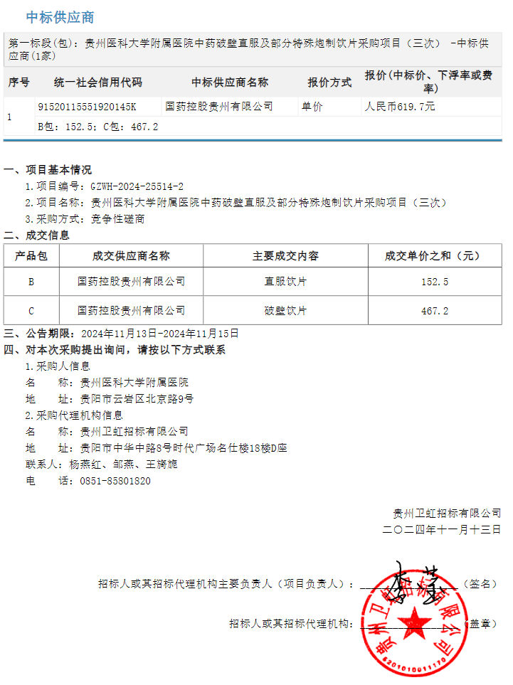【贵州医科大学附属医院】贵州医科大学附属医院中药破壁直服及部分特殊炮制饮片采购项目(三次)成交公告