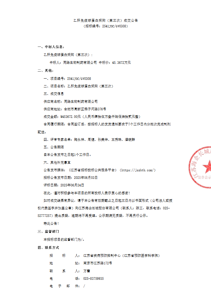 【江苏省疾病预防控制中心】江苏省疾病预防控制中心(江苏省预防医学科学院)乙肝免疫球蛋白采购(第三次)成交公告