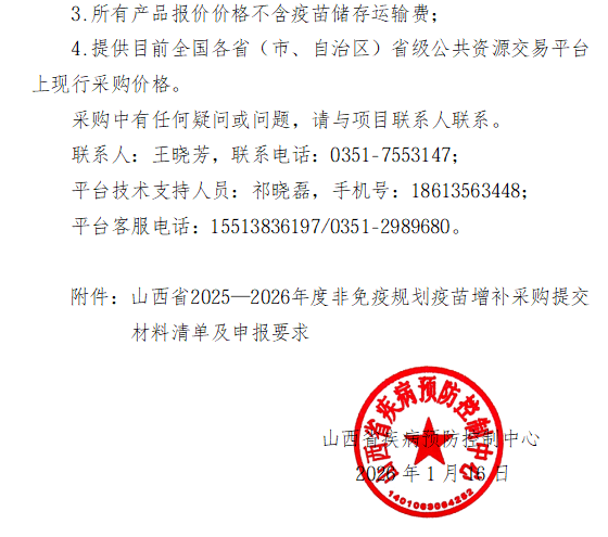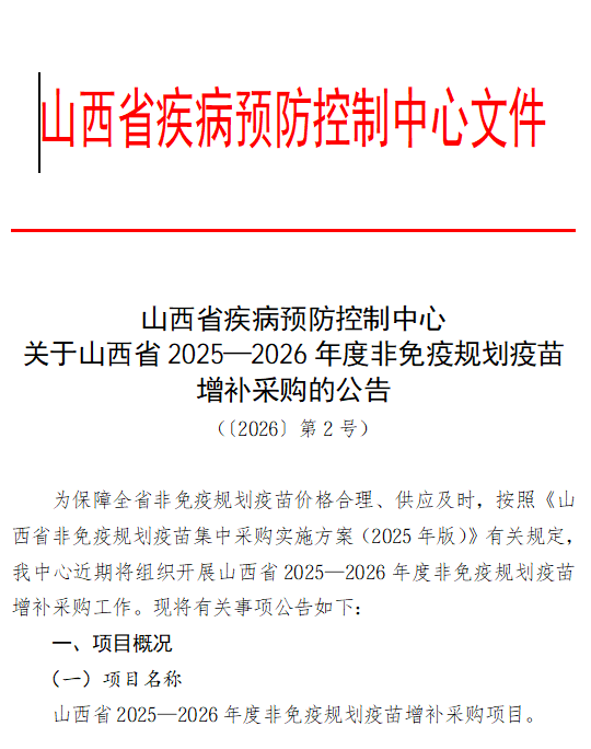 【山西】山西省疾病预防控制中心关于山西省2025-2026年度非免疫规划疫苗增补采购的公告