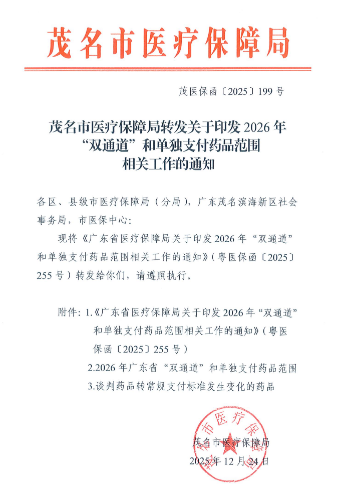 【茂名】茂名市医疗保障局转发关于印发2026年“双通道”和单独支付药品范围相关工作的通知
