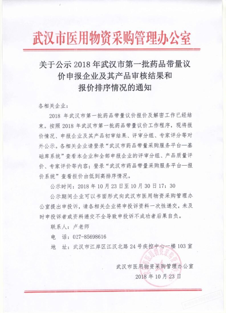 【武汉】关于公示2018年武汉市第一批药品带量议价申报企业及其产品审核结果和报价排序情况的通知