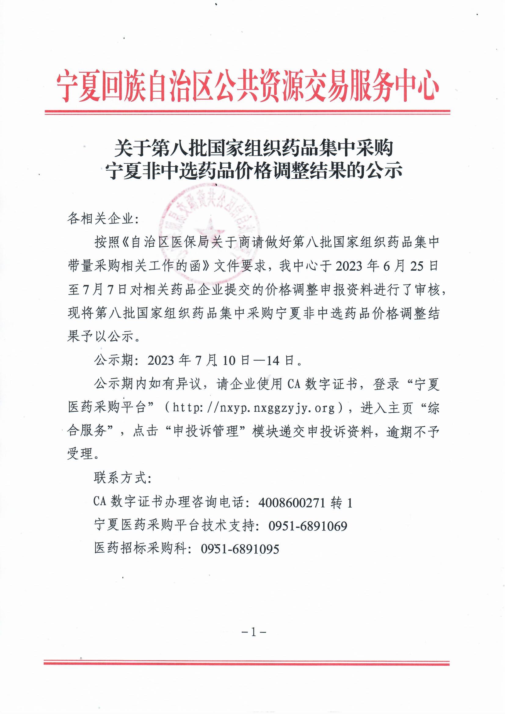 现将第八批国家组织药品集中采购宁夏非中选药品价格调整结果予以公示。