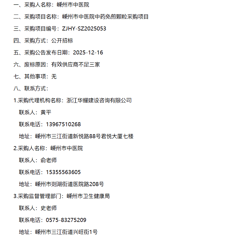 【绍兴市嵊州市中医院】浙江省嵊州市中医院中药免煎颗粒采购项目废标公告(非政府采购项目)