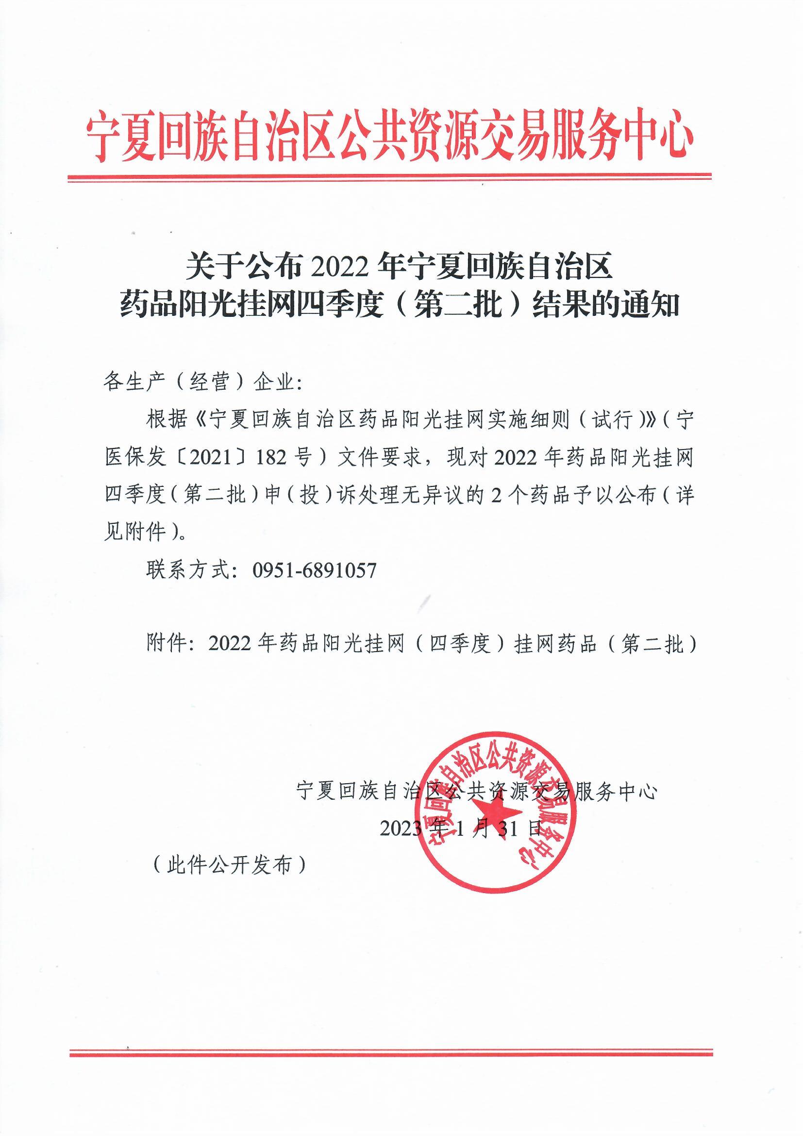 【宁夏】关于公布2022年宁夏回族自治区药品阳光挂网四季度(第二批)结果的通知