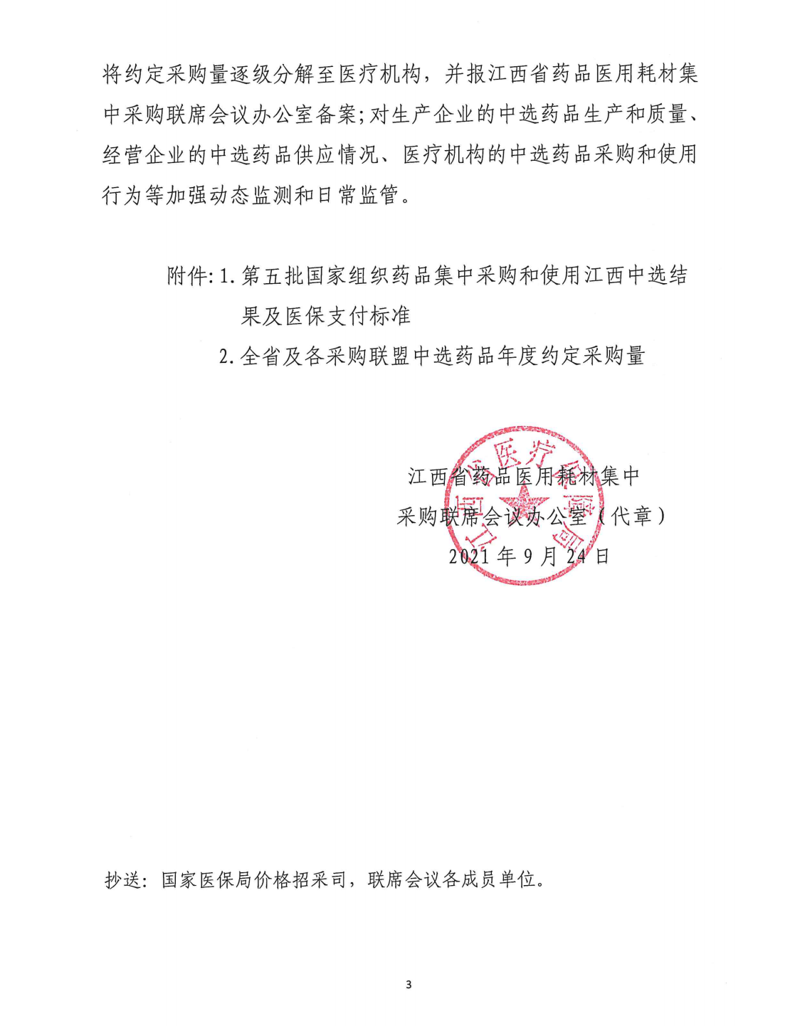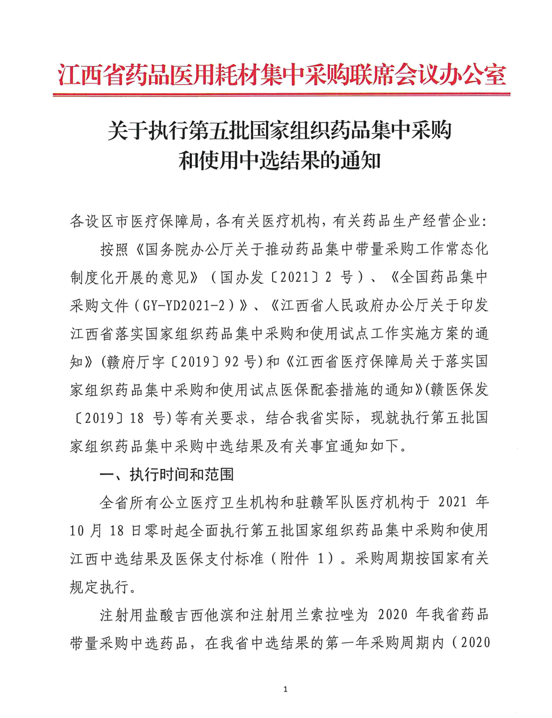【江西】2021年江西省药品医用耗材集中采购联席会议办公室关于执行第五批国家组织药品集中采购和使用中选结果的通知(转)