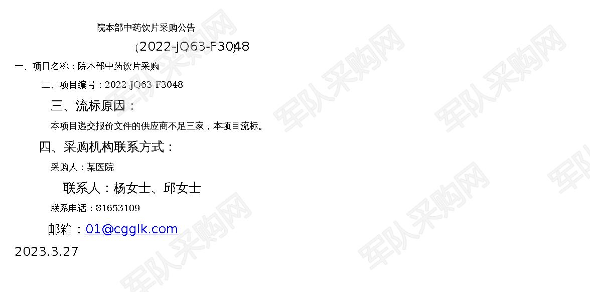 【军队采购】军队采购网院本部中药饮片采购2022-JQ63-F3048