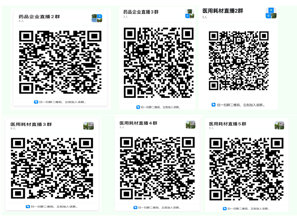 近期,接到部分企业咨询药品和医用耗材日常业务办理有关问题,为进一步做好我省药品和医用耗材集中采购工作,决定于6月30日上午9:30—10:30开展网上直播。相关单位可搜索下载直播APP“钉钉”,点击右上角“+”扫描以下群直播二维码,加入直播群。已在群内的企业无需重复添加,我们将开展药品直播1-3群和医用耗材直播1-5群联播模式。