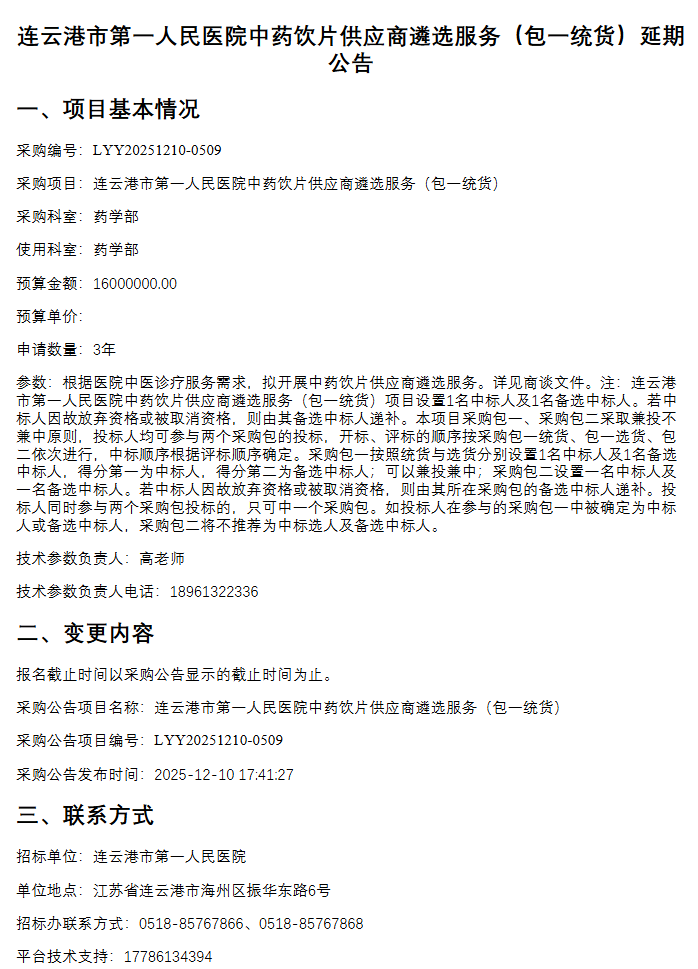 【连云港市第一人民医院】江苏省连云港市第一人民医院中药饮片供应商遴选服务(包一统货)延期公告
