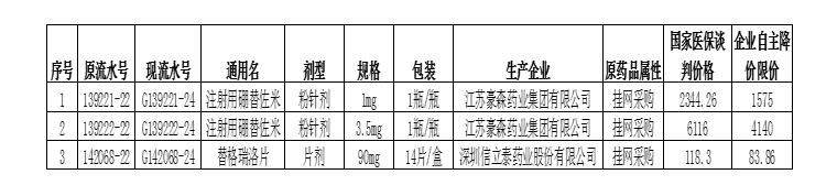 依据《人力资源社会保障部关于将36种药品纳入国家基本医疗保险、工伤保险和生育保险药品目录乙类范围的通知》(人社部发〔2017〕54号),由药品生产企业申请,现将相关药品统一调整为“国家医保谈判药品”,并根据企业自主申请下调相关药品的“企业自主降价限价”(详见下表),请各医疗机构及时下调价格。