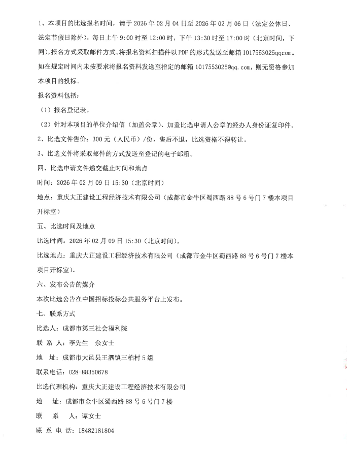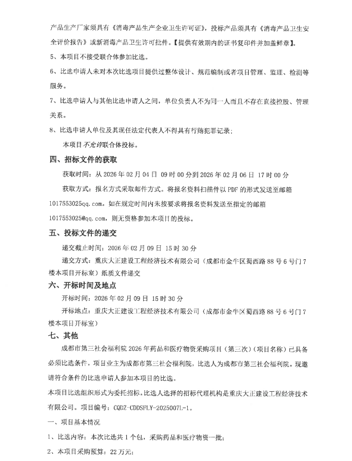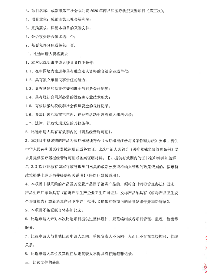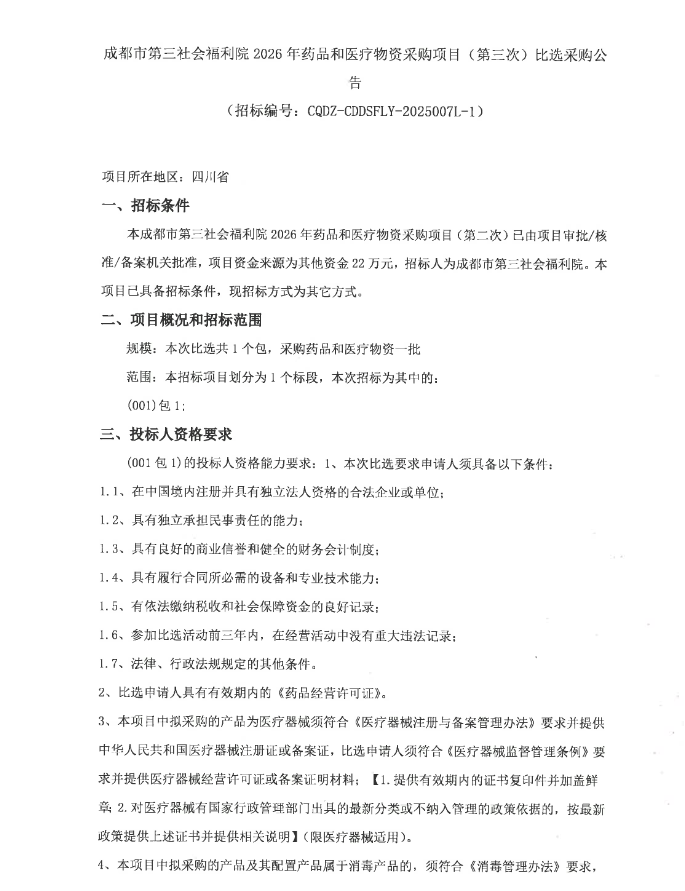 【成都市第三社会福利院】四川省成都市第三社会福利院2026年药品和医疗物资采购项目(第三次)比选采购公告