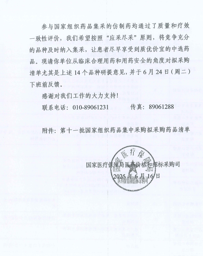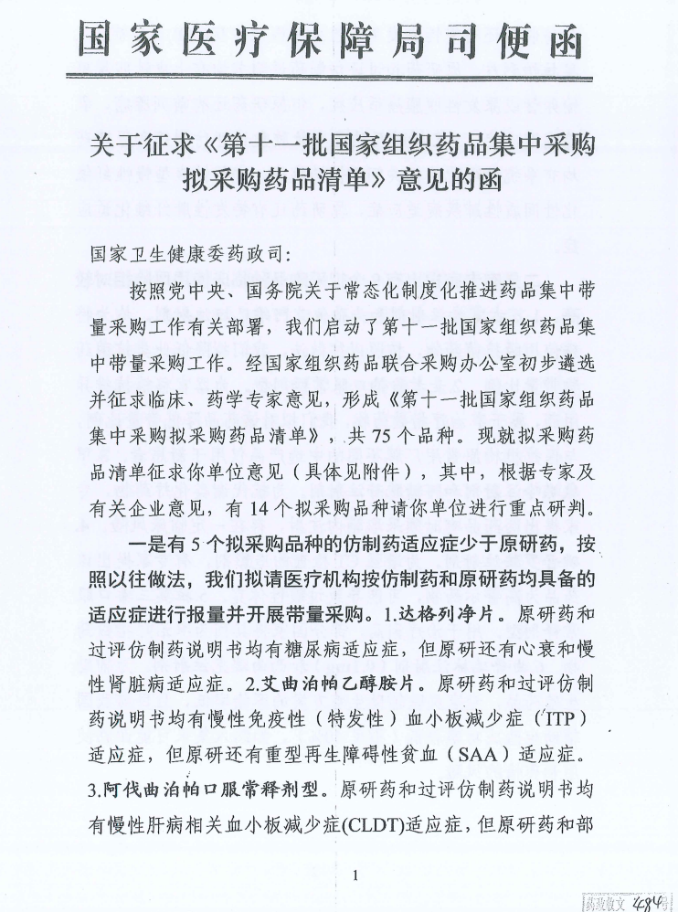 【国家】关于征求《第十一批国家组织药品集中采购拟采购药品清单》意见的函