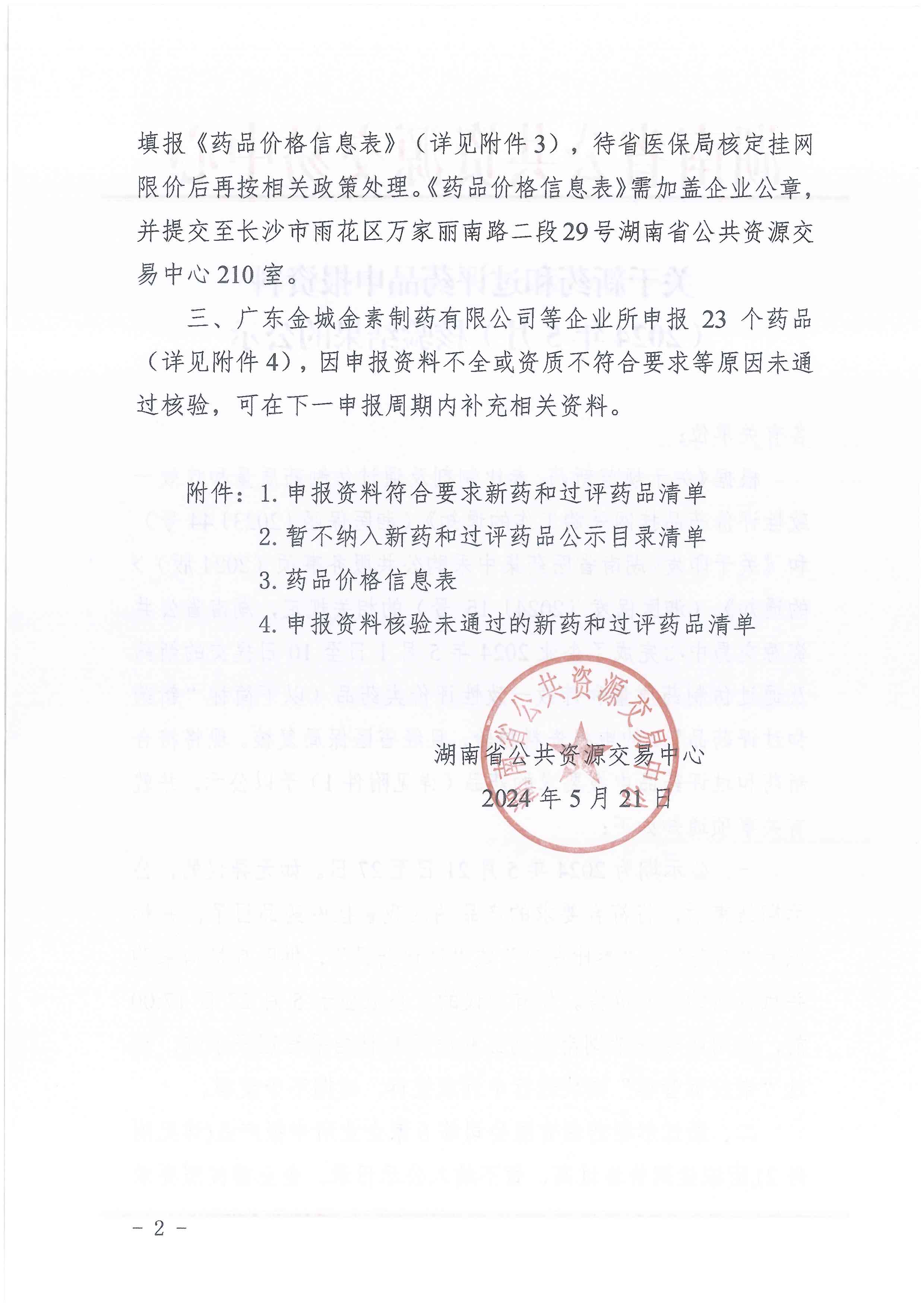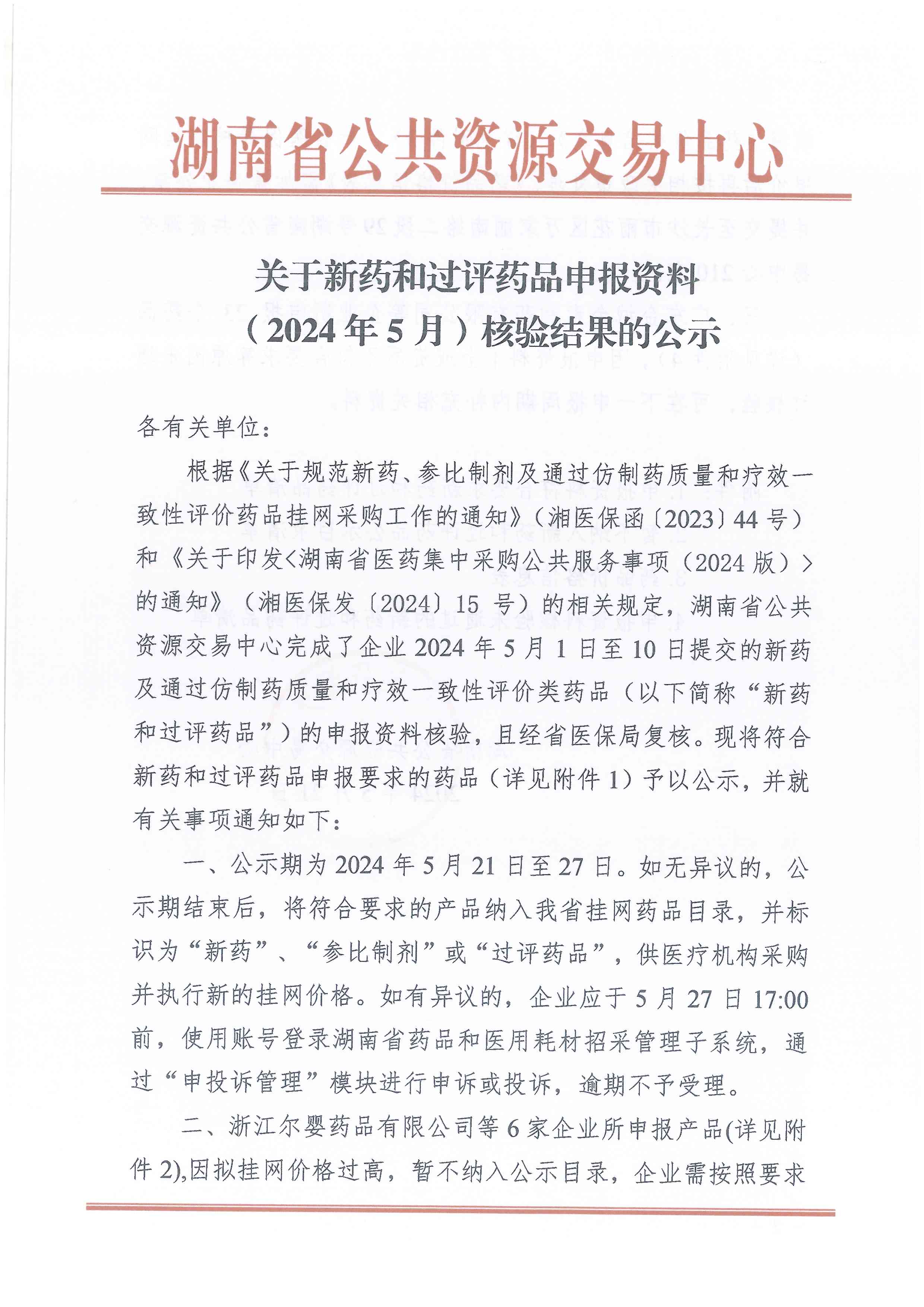 根据《关于规范新药、参比制剂及通过仿制药质量和疗效一致性评价药品挂网采购工作的通知》(湘医保函(2023)44号)和《关于印发<湖南省医药集中采购公共服务事项(2024版)>的通知》(湘医保发〔2024)15号〕的相关规定,湖南省公共资源交易中心完成了企业2024年5月1日至10日提交的新药及通过仿制药质量和疗效一致性评价类药品(以下简称“新药和过评药品”)的申报资料核验,且经省医保局复核。现将符合新药和过评药品申报要求的药品(详见附件1)予以公示,并就有关事项通知如下: