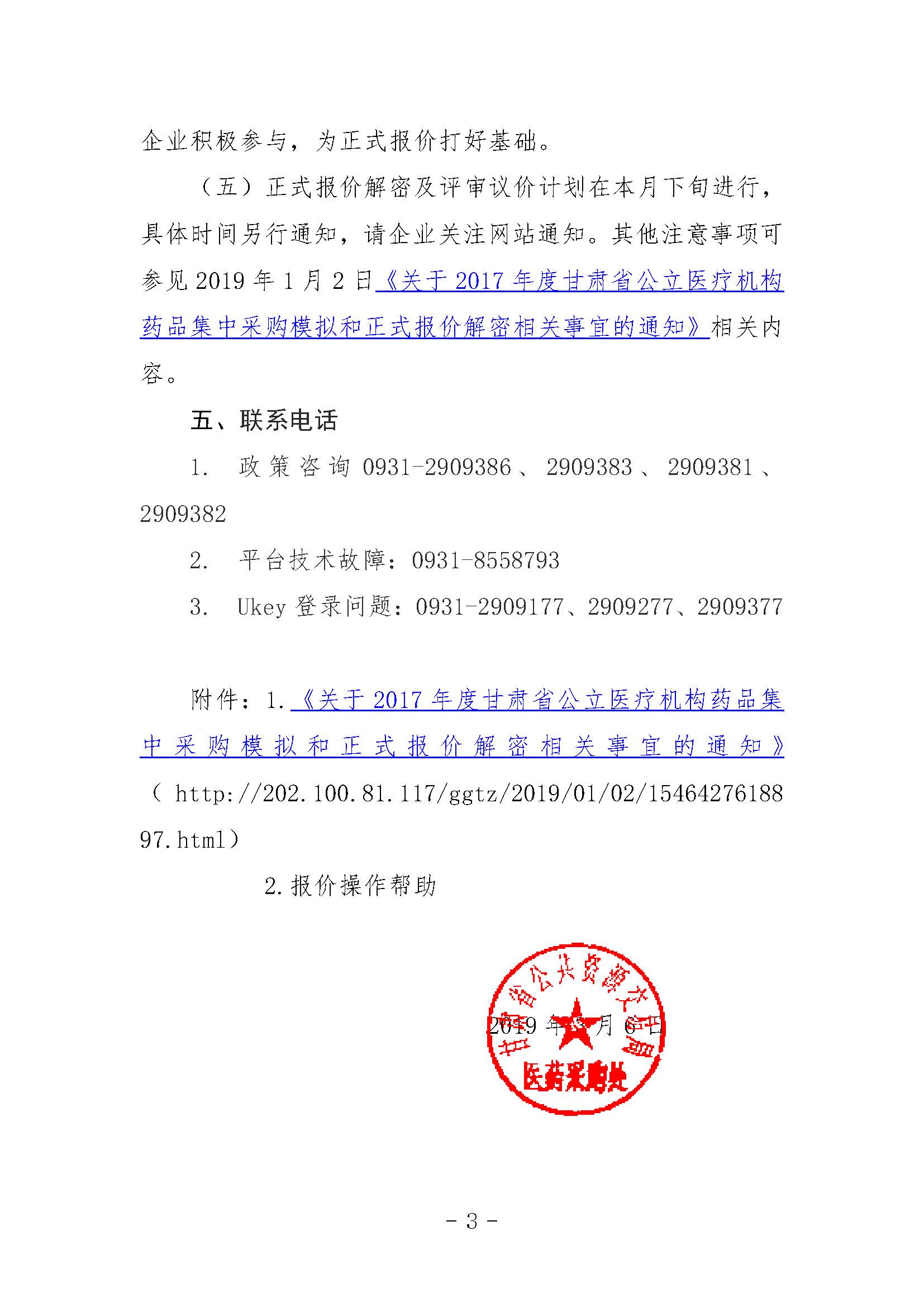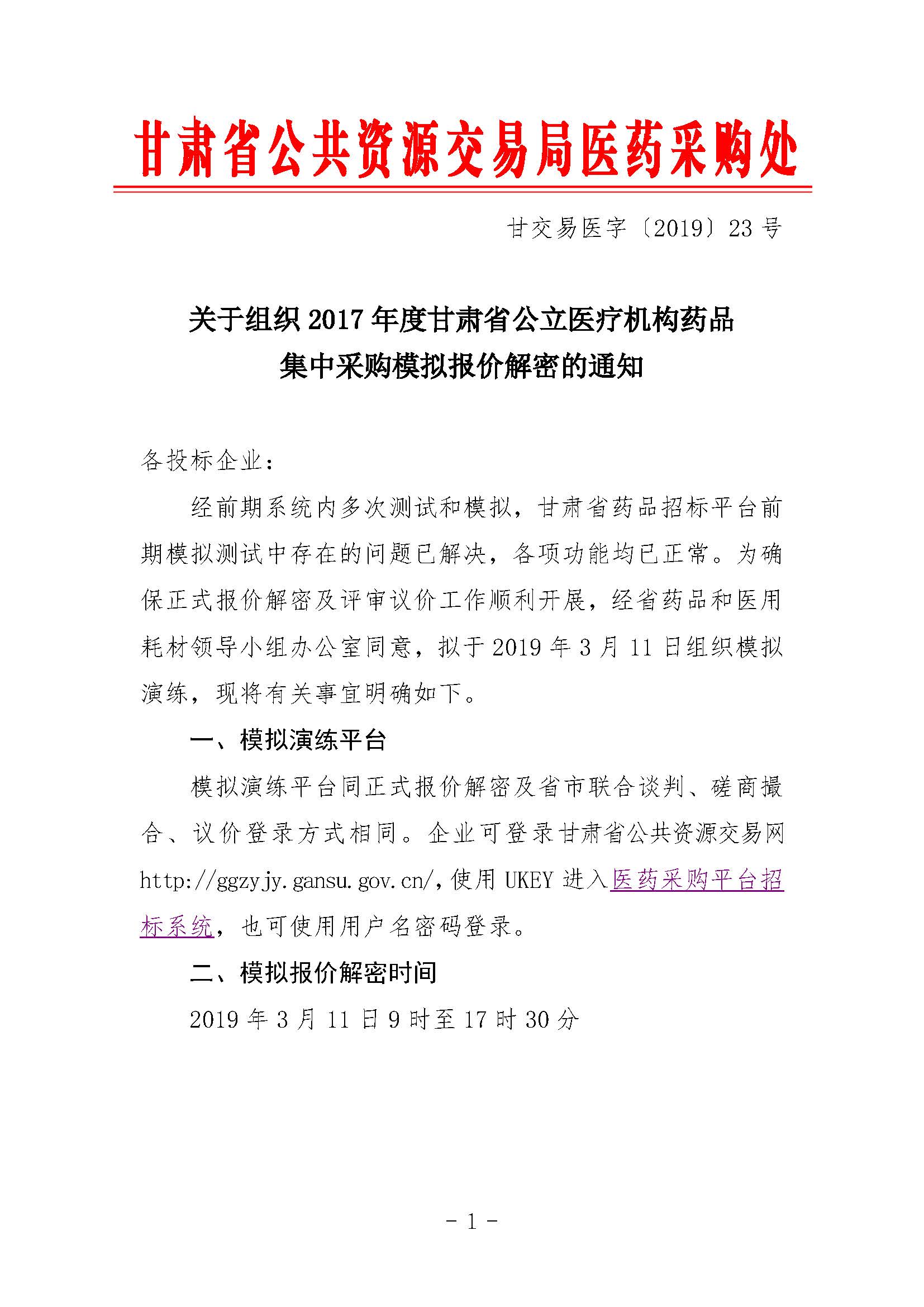 【甘肃】甘肃省关于组织2017年度甘肃省公立医疗机构药品集中采购模拟报价解密的通知 甘交易医字〔2019〕23号