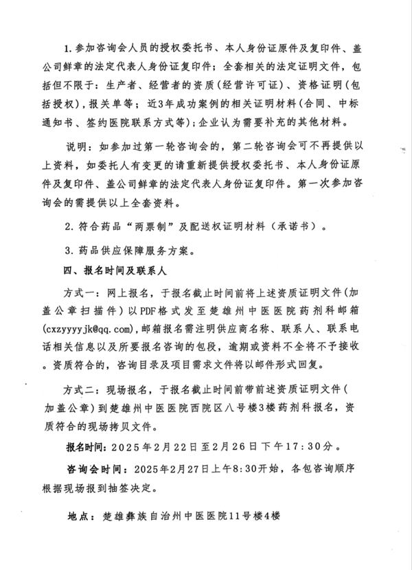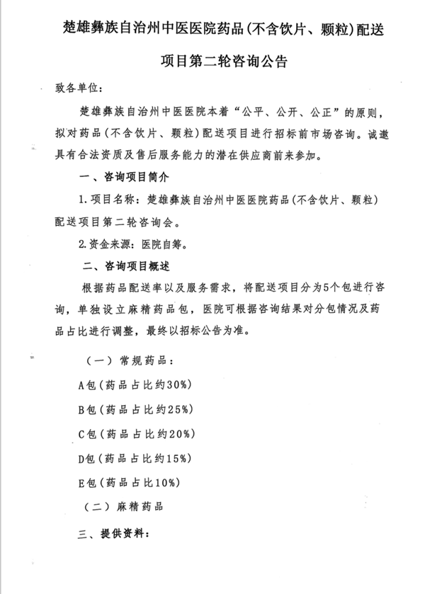 【楚雄州中医医院】云南省楚雄州中医医院药品(不含饮片、颗粒)配送项目第二轮咨询公告