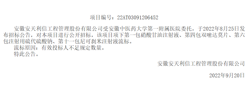 【安徽中医药大学第一附属医院】采购2022年部分药品(第一批)流标公示