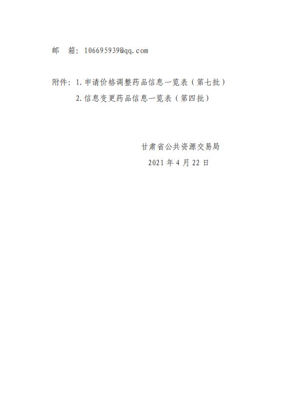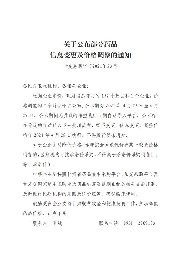 【甘肃】甘肃省关于公布部分药品信息变更及价格调整的通知(20210422)