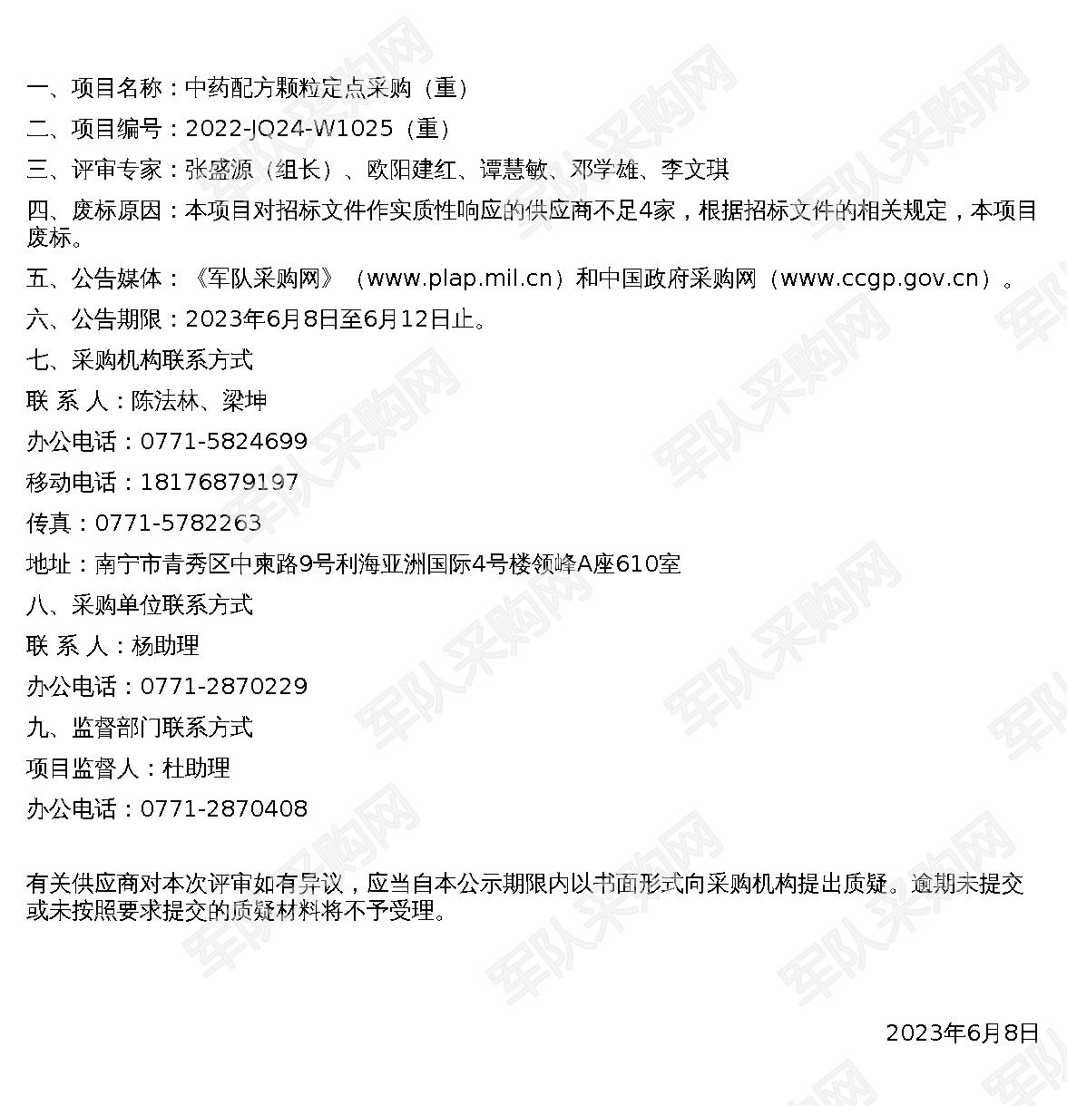 【南宁市某医院】军队采购网南宁市某医院中药配方颗粒定点采购(重)评审结果公示〔项目编号:2022-JQ24-W1025(重)〕