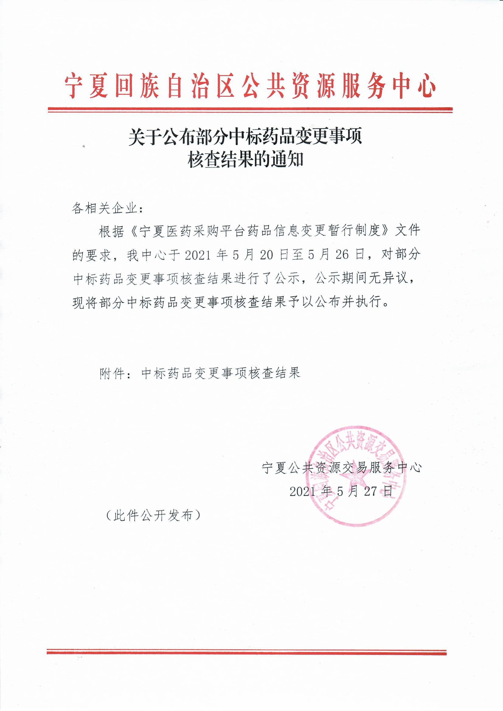 【宁夏】2021年宁夏自治区关于公布部分中标药品变更事项核查结果的通知