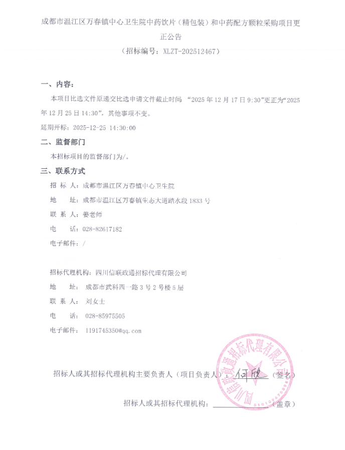 【成都市温江区万春镇中心卫生院】四川省成都市温江区万春镇中心卫生院中药饮片(精包装)和中药配方颗粒采购项目更正公告