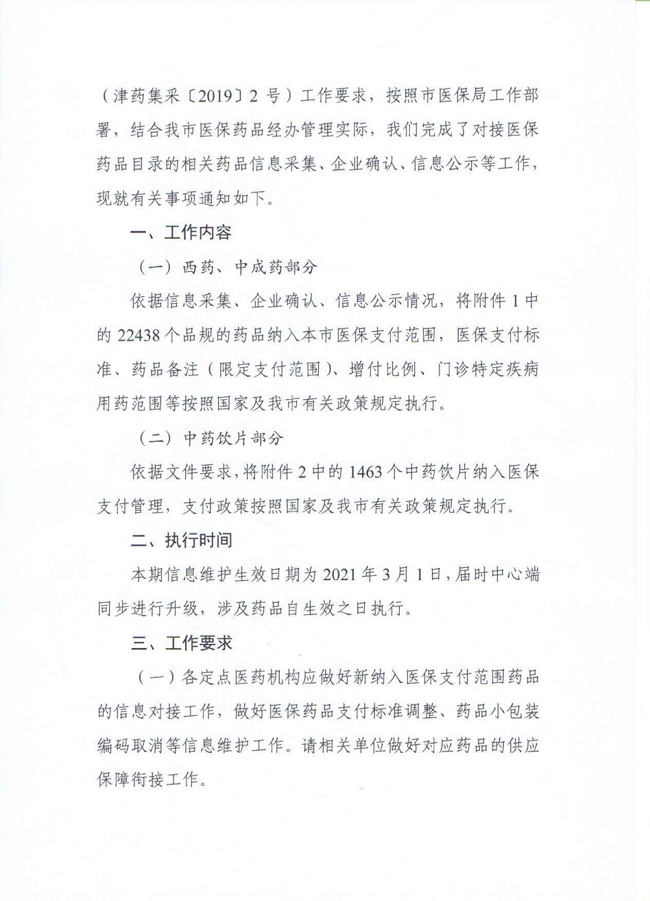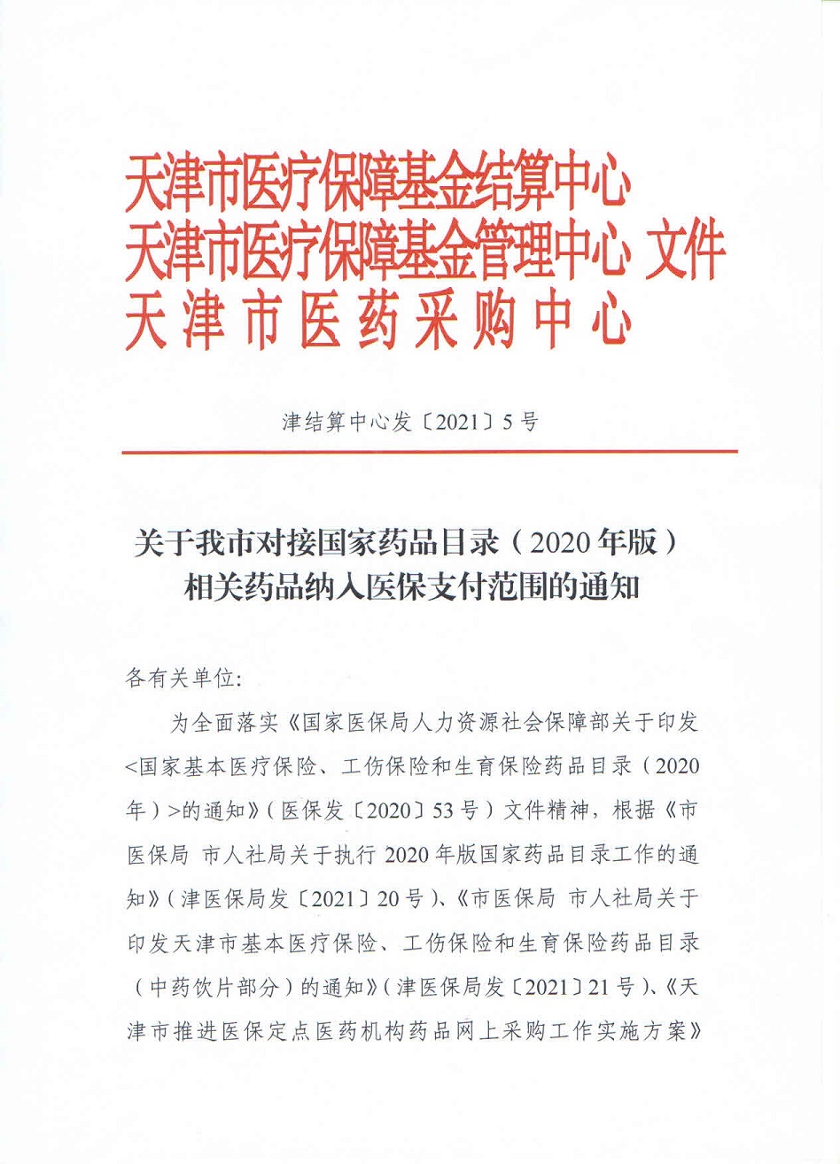 【天津】2021年天津市关于我市对接国家药品目录(2020年版)相关药品纳入医保支付范围的通知