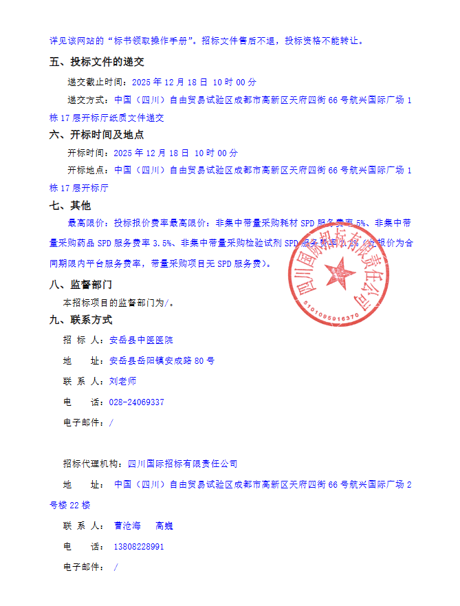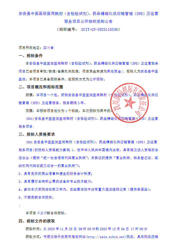 【资阳市安岳县中医医院】四川省资阳市安岳县中医医院医用耗材(含检验试剂)、药品精细化供应链管理(SPD)及运营服务项目公开招标采购公告