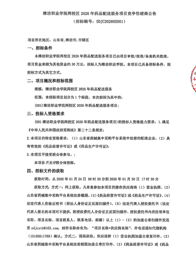 【潍坊职业学院】山东省潍坊职业学院两校区2026年药品配送服务项目竞争性磋商公告