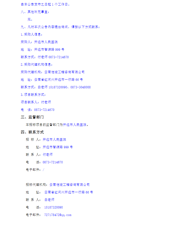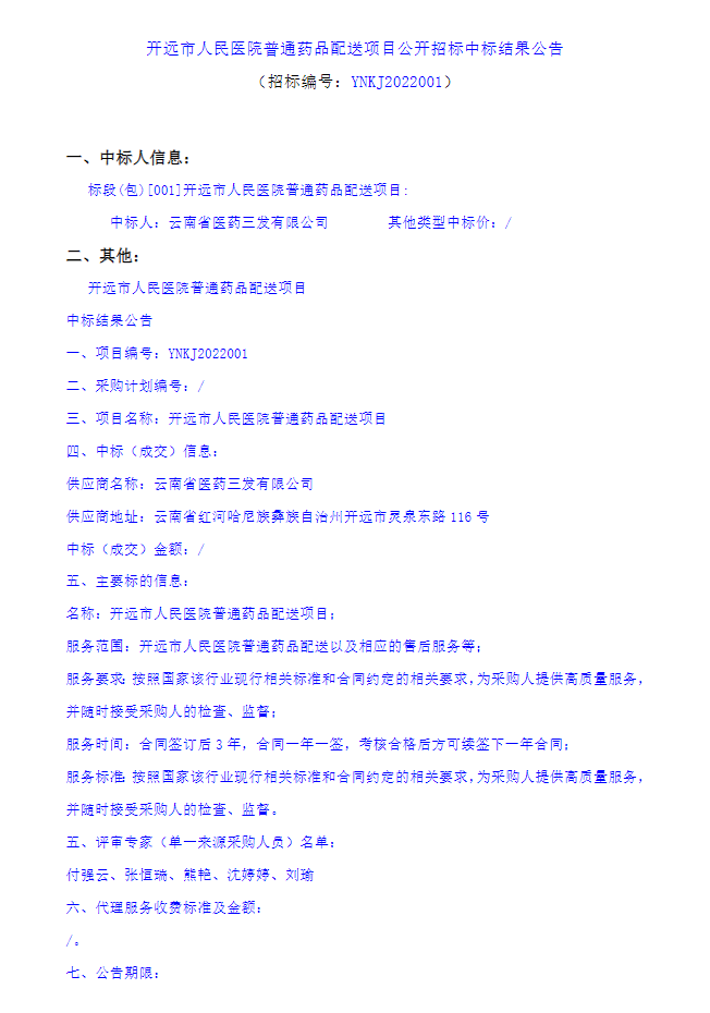 【开远市人民医院】云南省红河哈尼族彝族自治州开远市人民医院普通药品配送项目公开招标中标结果公告