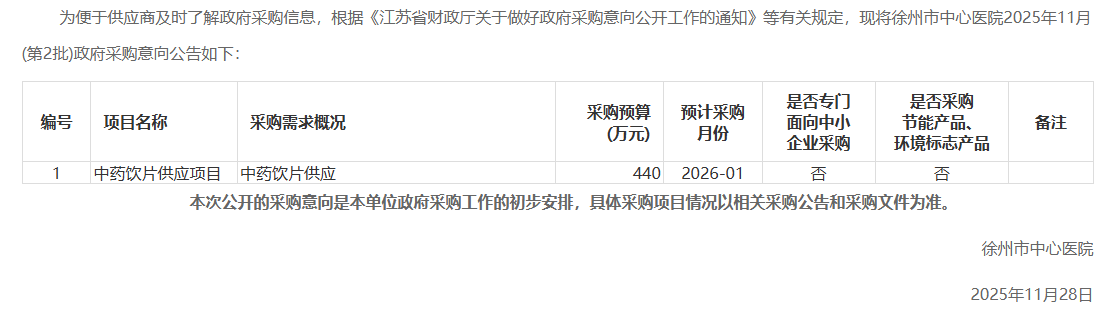 【徐州市中心医院】江苏省徐州市中心医院2025年11月(第2批)政府采购意向公告