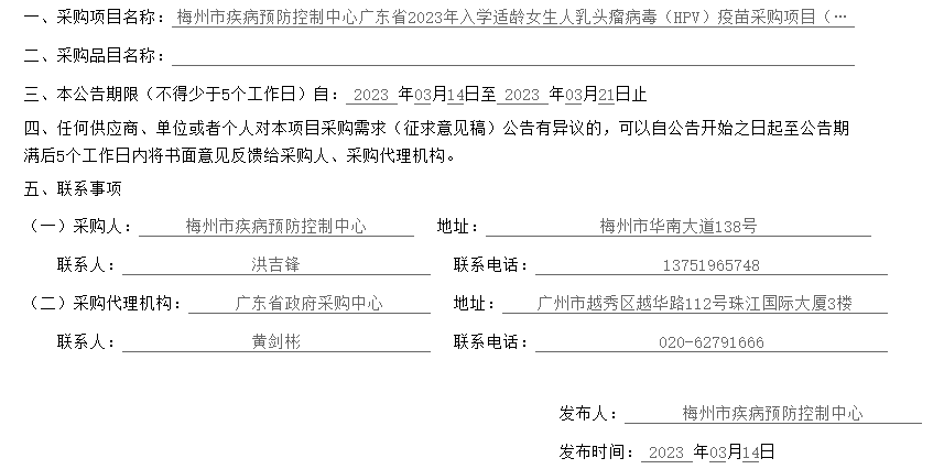 【梅州市疾病预防控制中心】广东省梅州市疾病预防控制中心广东省2023年入学适龄女生人乳头瘤病毒(HPV)疫苗采购项目(梅州市)采购需求征求意见公告