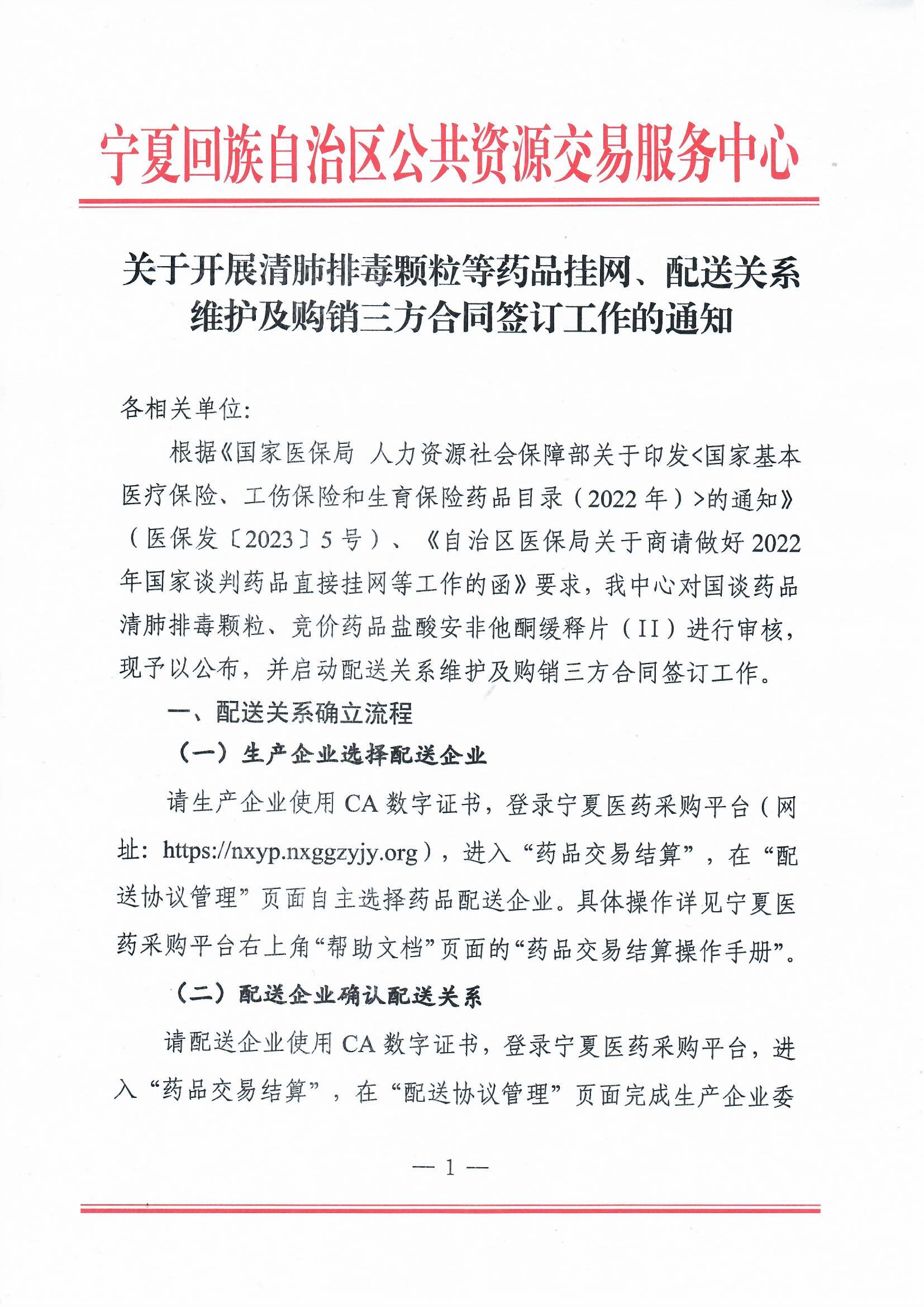 根据《国家医保局 人力资源社会保障部关于印发<国家基本医疗保险、工伤保险和生育保险药品目录(2022年)>的通知》(医保发〔2023〕5号)、《自治区医保局关于商请做好2022 年国家谈判药品直接挂网等工作的函》要求,我中心对国谈药品清肺排毒颗粒、竞价药品盐酸安非他酮缓释片(II)进行审核,现予以公布,并启动配送关系维护及购销三方合同签订工作。