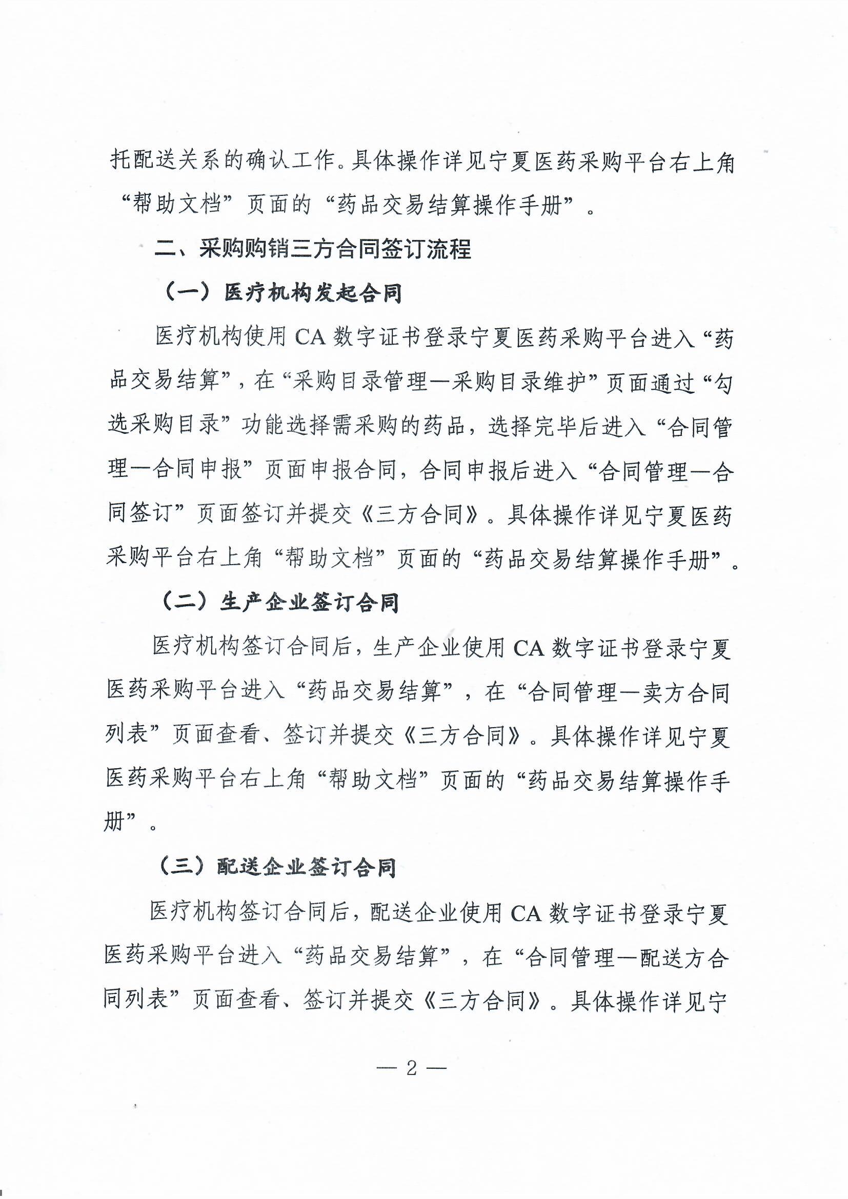 医疗机构签订合同后,生产企业使用CA数字证书登录宁夏医药采购平台进入“药品交易结算”,在“合同管理一卖方合同列表"页面查看、签订并提交《三方合同》。具体操作详见宁夏医药采购平台右上角“帮助文档”页面的“药品交易结算操作手册”。