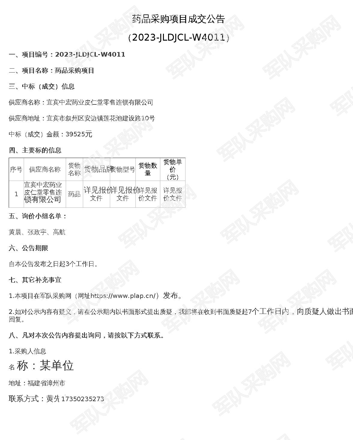 【军队采购】军队采购网药品采购项目成交公告(2023-JLDJCL-W4011)