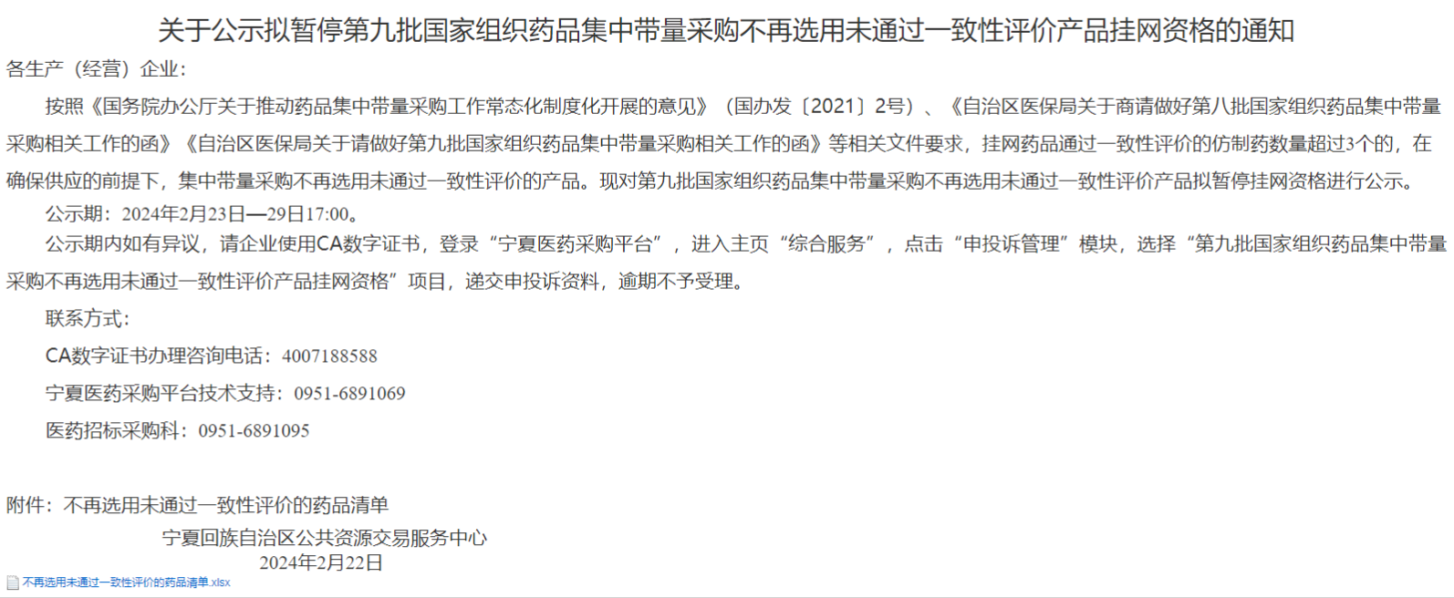 按照《国务院办公厅关于推动药品集中带量采购工作常态化制度化开展的意见》(国办发[2021]2号)、《自治区医保局关于商请做好第八批国家组织药品集中带量采购相关工作的函》《自治区医保局关于请做好第九批国家组织药品集中带量采购相关工作的函》等相关文件要求,挂网药品通过一致性评价的仿制药数量超过3个的,在确保供应的前提下,集中带量采购不再选用未通过一致性评价的产品。现对第九批国家组织药品集中带量采购不再选用未通过一致性评价产品拟暂停挂网资格进行公示。公示期:2024年2月23日—29日17:00。
