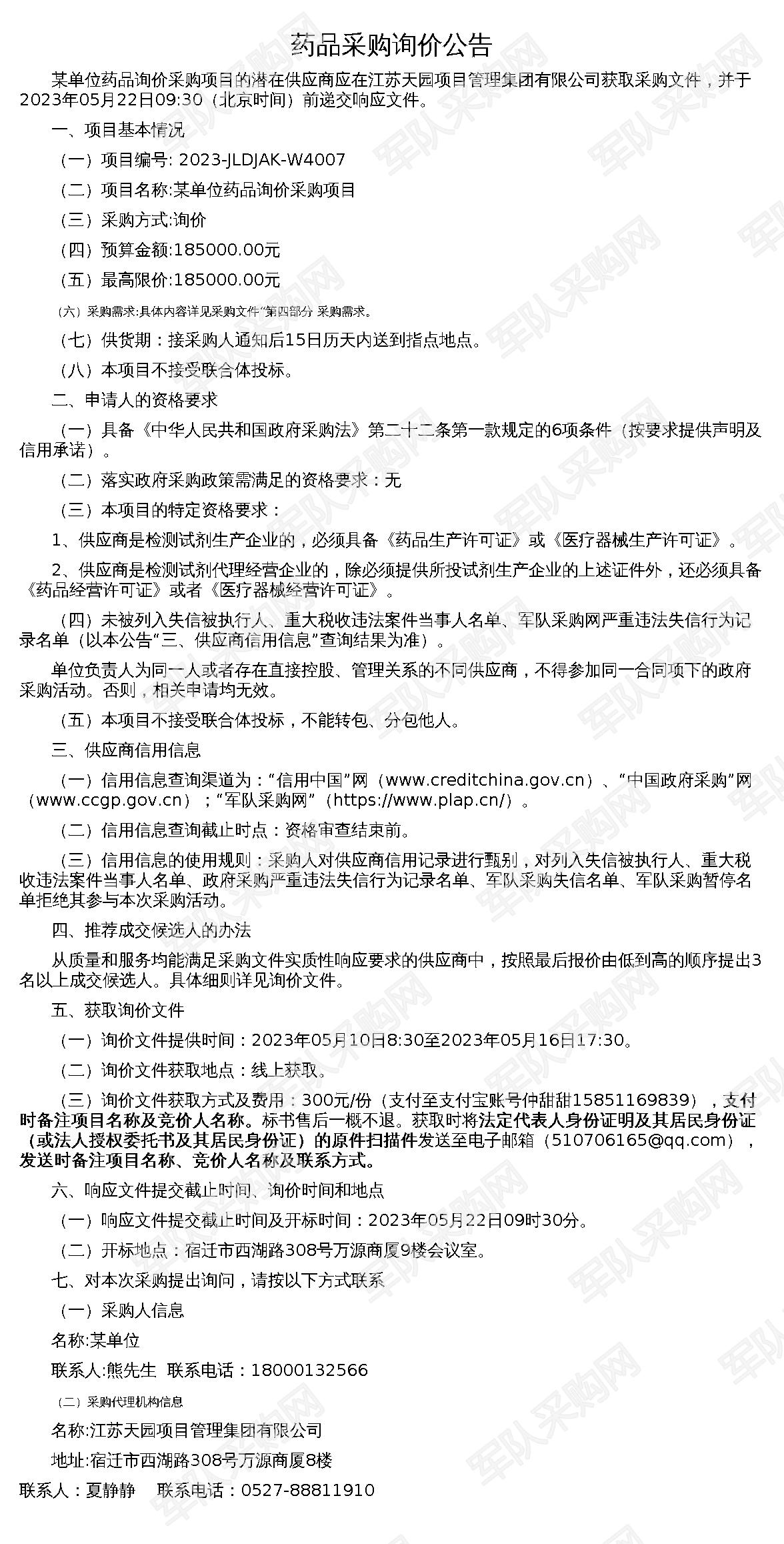【军队采购】军队采购网某单位药品询价采购项目公告(2023-JLDJAK-W4007)