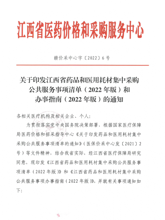 为贯彻落实党中央国务院决策部署,根据国家医疗保障局医药价格和招采指导中心《关于印发药品和医用耗材集中采购公共服务事项清单的通知》(医保价采中心发〔2021〕2 号)等文件精神,结合我省实际,经江西省医疗保障局研究同意,现印发《江西省药品和医用耗材集中采购公共服务事项清单(2022年版)》和《江西省药品和医用耗材集中采购公共服务事项办事指南(2022年版)》,并就有关事项通知如下∶